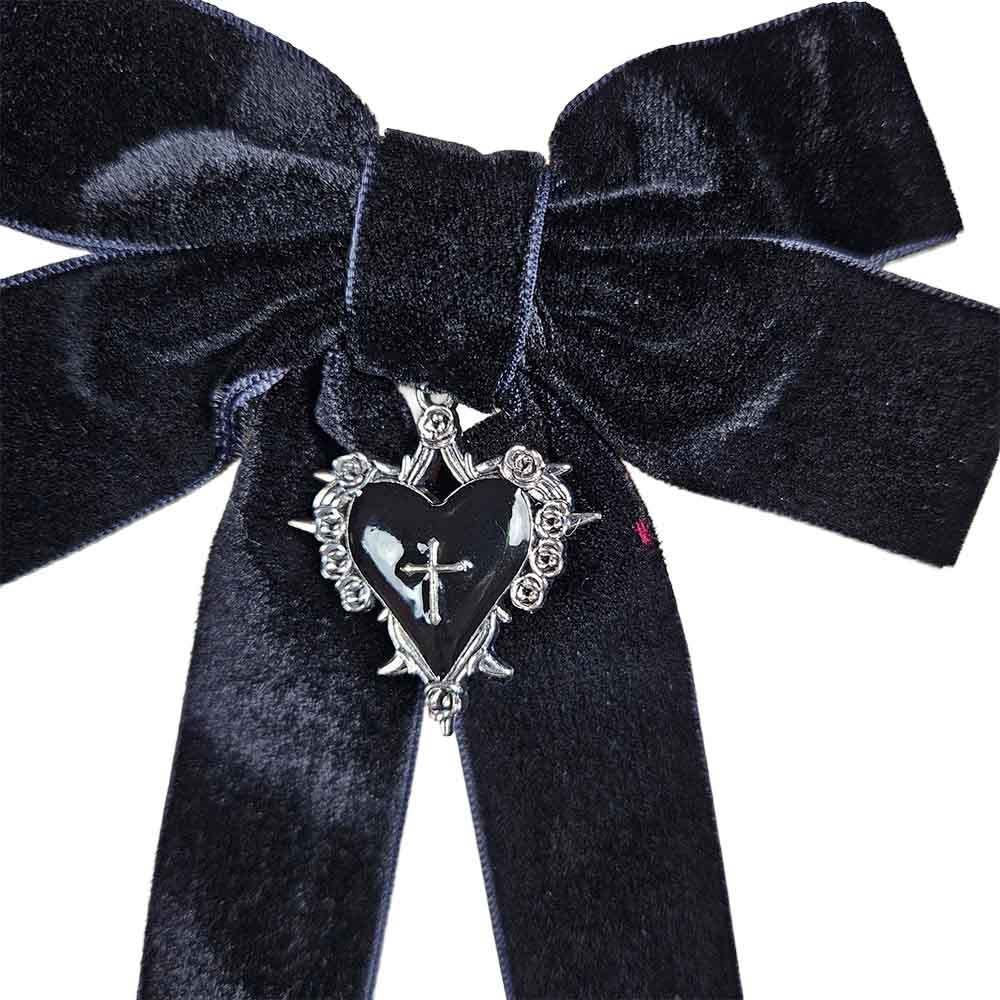 Darkly romantic and full of edge, this velvet hair bow features a 3 x 3.5 cm alloy charm with a thorned rose, cross, and heart motif. Perfect for lovers of gothic fashion, mourning aesthetics, or adding a touch of cursed beauty to your look.