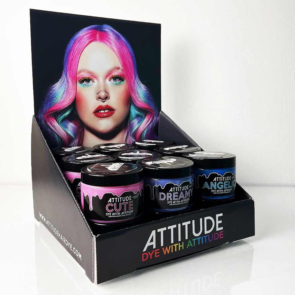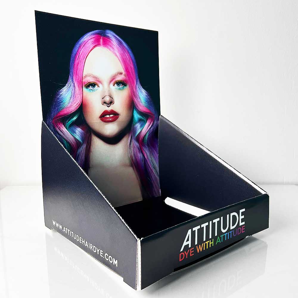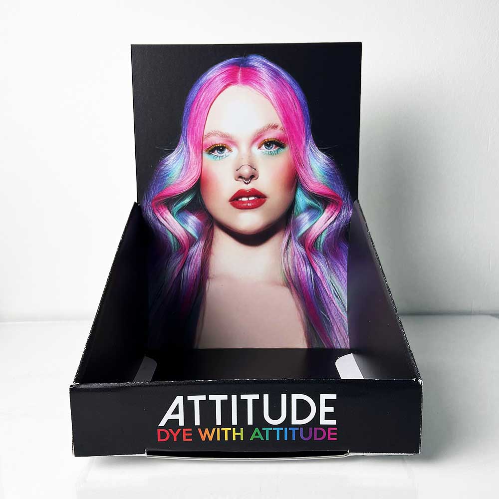 Make a statement with Attitude's A4 Hair De Pot Cardboard Table Display. Stylish, sustainable, and perfect for presenting our vibrant hair dye collection.
